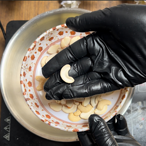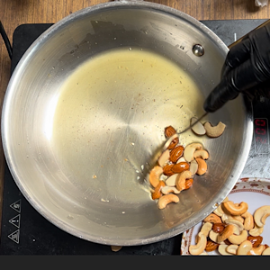 Take another pan and add 2 tbsp of desi ghee. When ghee melts, add almonds and cashews, which are cut into halves.