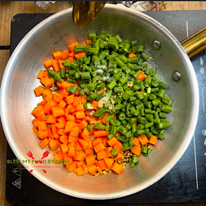 • Add chopped carrots and green beans. They should be cut in the similar size so that both get cooked at the same time.