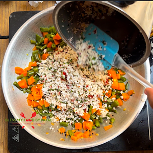 Add chopped carrots and green beans. They should be cut in the similar size so that both get cooked at the same time. Add salt and hing. Mix.