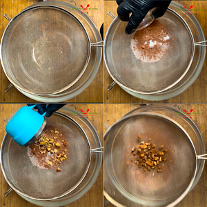 - Put a sieve on a bowl and add ragi flour, cocoa powder, baking soda, salt and walnuts.