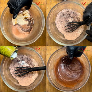 Then add powdered brown sugar, oil and vanilla essence. Mix them. Lastly add milk but little at a time and keep mixing. The batter should come to a ribbon consistency.