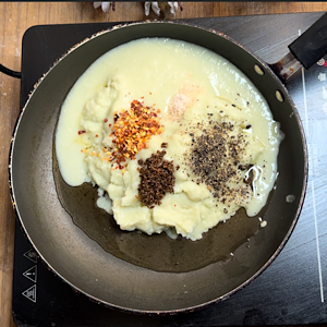 Heat oil in a pan. Add cauliflower puree, salt, Oregano, black pepper powder and red chilli flakes.